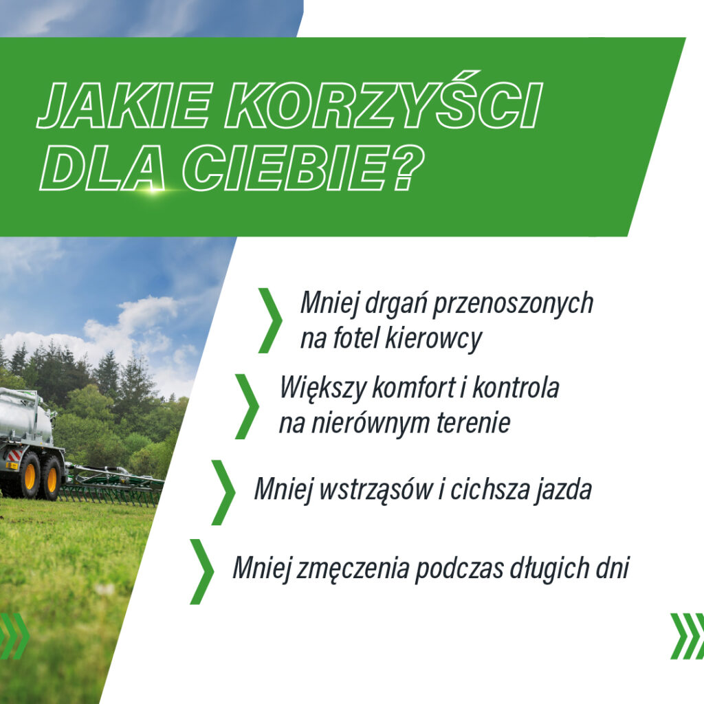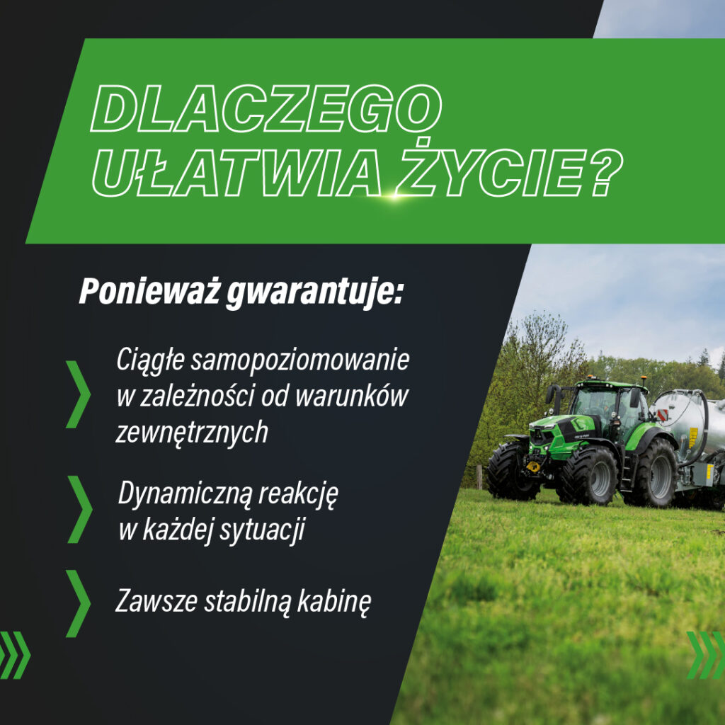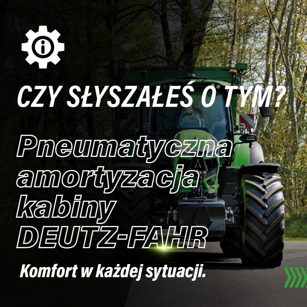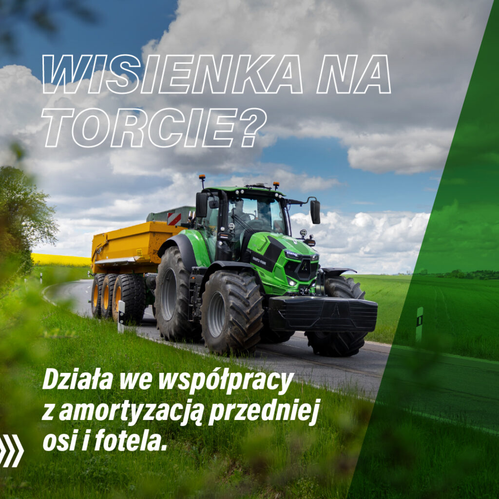 Amortyzacja pneumatyczna zaprojektowana przez DEUTZ-FAHR, dynamicznie reaguje na warunki pracy, zapewniając stabilność i idealne poziomowanie kabiny – nawet w trudnym terenie lub w trakcie jazdy w transporcie z dużą prędkością.